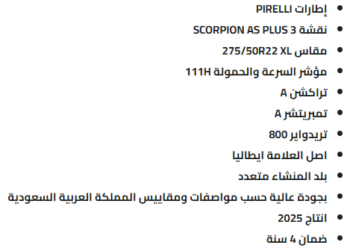 كفرات بيرللي خيار مثالي لسيارات الدفع الرباعي الفاخرة . يتميز بتقنية NCS (Noise Cancelling System) لتقليل الضوضاء داخل المقصورة، مما يوفر قيادة أكثر هدوء وراحة.